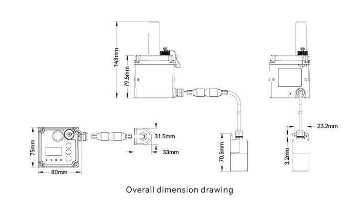 OUTLINE DIMENSIONS | Transmitter: 80mmx75mmx143mm Probe: 33mmx31.5mmx70.5mm |